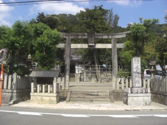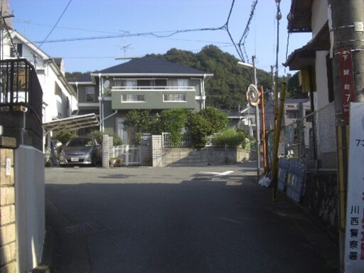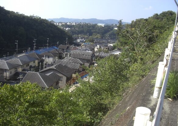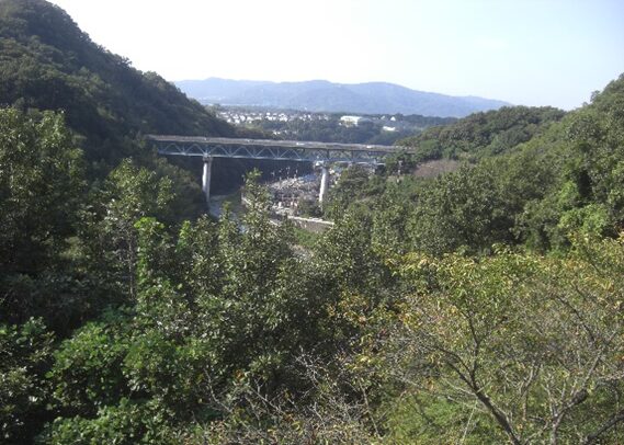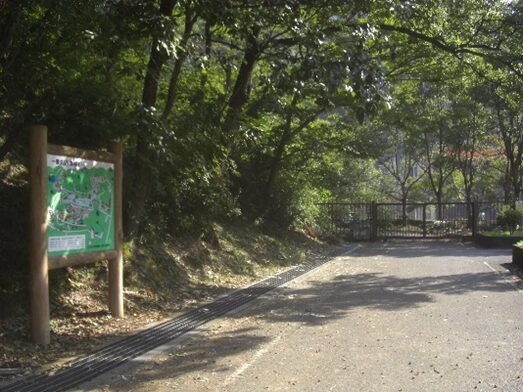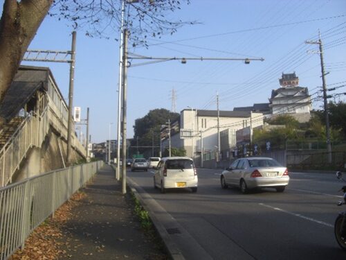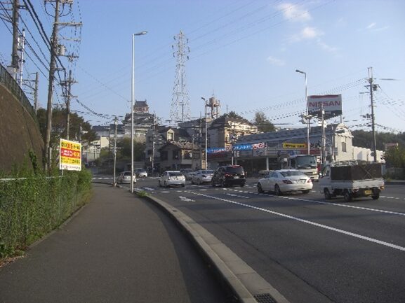 右の高台にあるお城のような建物は大阪青山歴史文学博物館。お城跡の天守閣と間違え紛らわしい