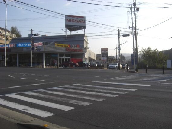 右蛙野駅から下って来る道路の高架下を潜って進む、潜った先右に川西北郵便局