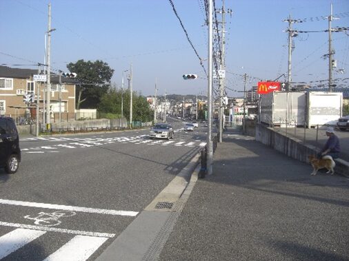 前川橋南信号で線路の上を越えり歩道橋を渡ると、前川橋前信号交差点に出て横断し北に進む