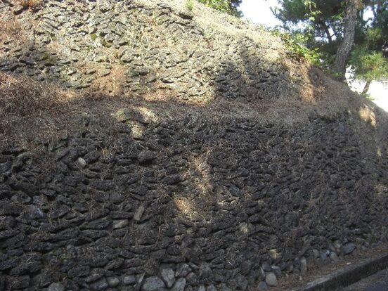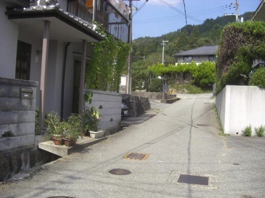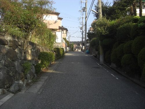 坂を下っていく左側に銅くず跡の塀、歴史を感じる