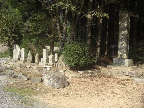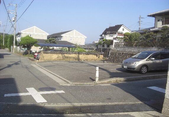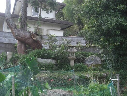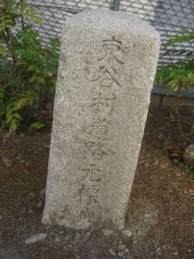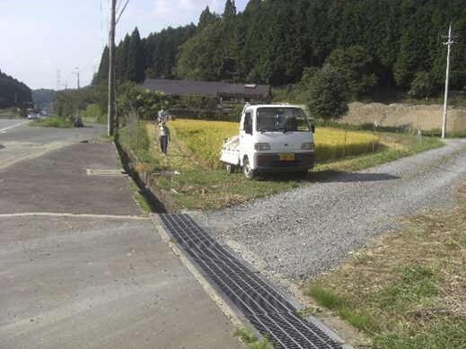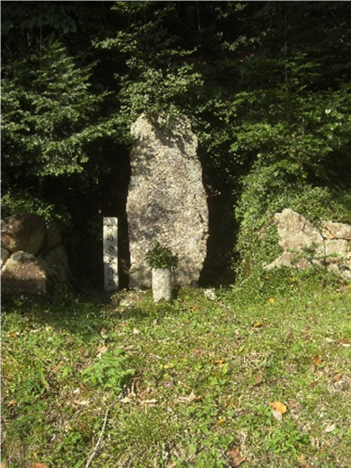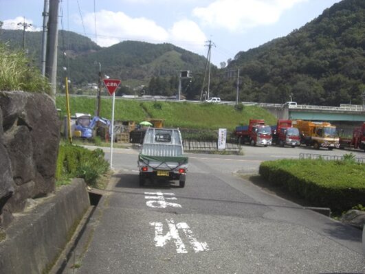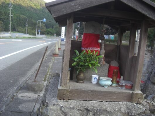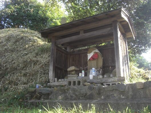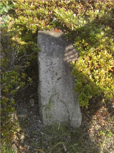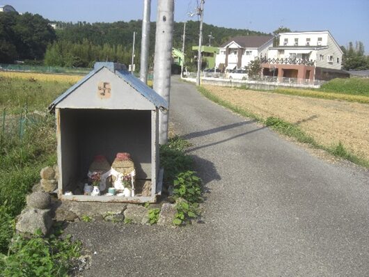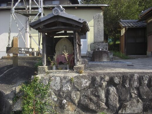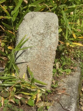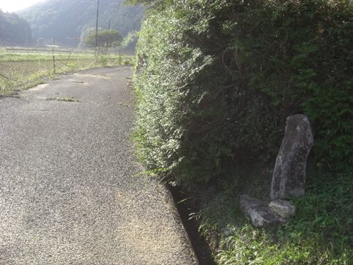 旧道は右に円を描いて進む道か、もしくは正面の人が歩いている畦道の左、電柱の真っ直ぐの道どちらか私は電柱の傍の真っ直ぐな細い道を進む。ただ軽自動車の前を右に入ったところ右に石造物が見えるので行ってみる