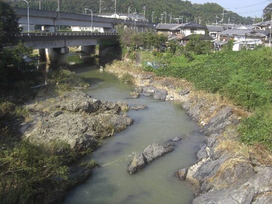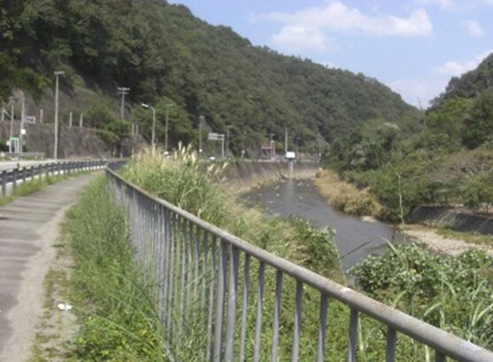 橋から川の上流を見る高架はバイパスで街道は川沿いの道で、高架の先で今から歩く道と合流する。その前方に見える堤は一庫ダム