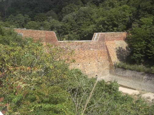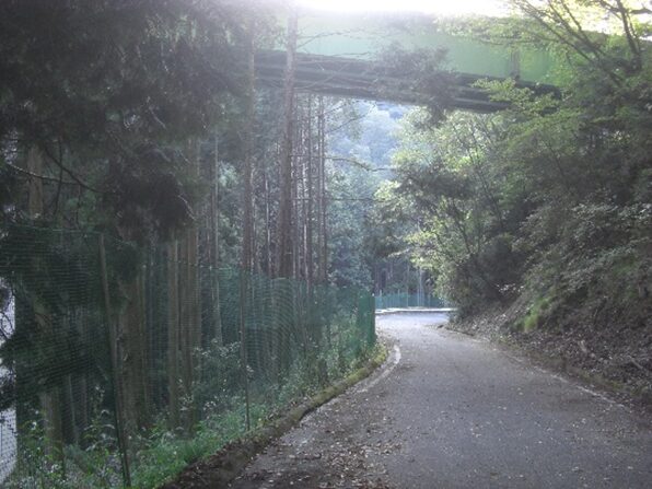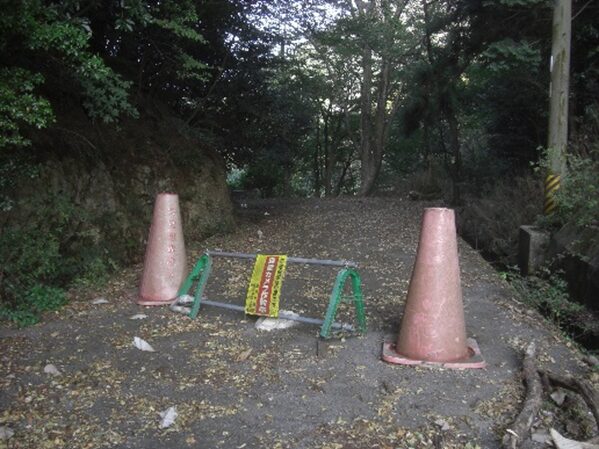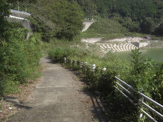一庫ダムの下で旧道は柵で閉鎖しており消失、左の雑木林の道を上っていく