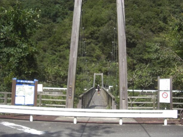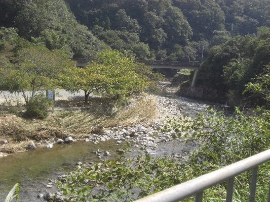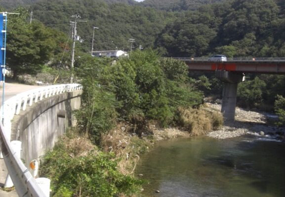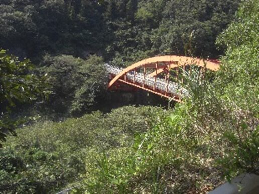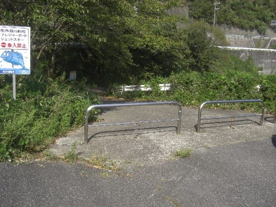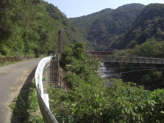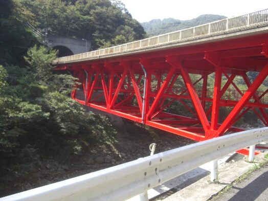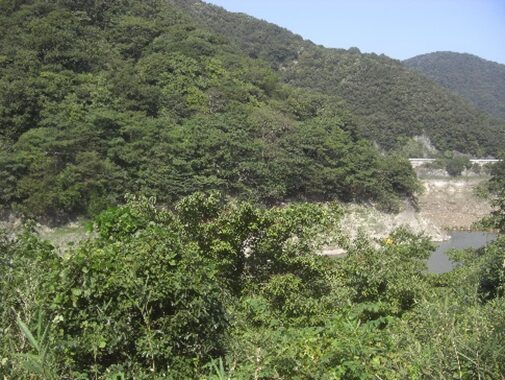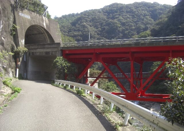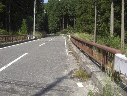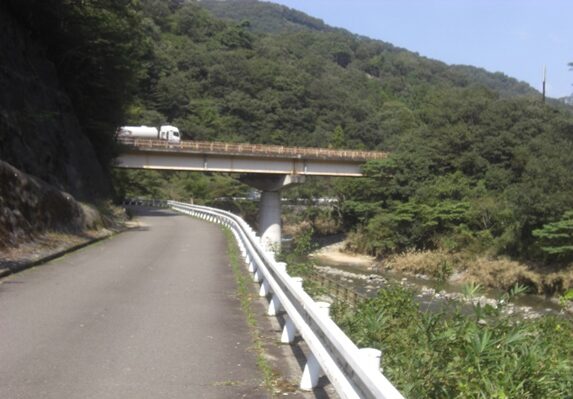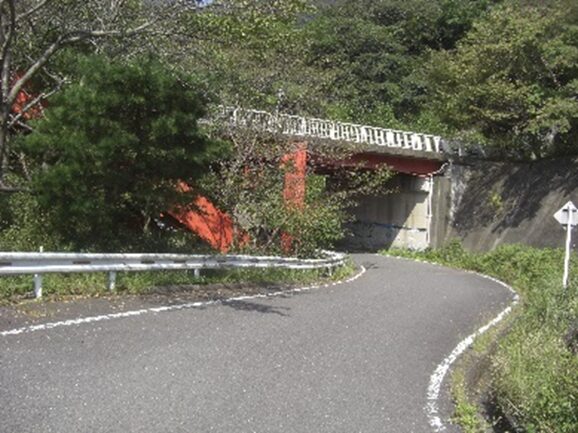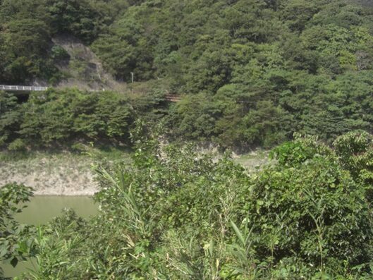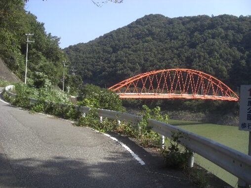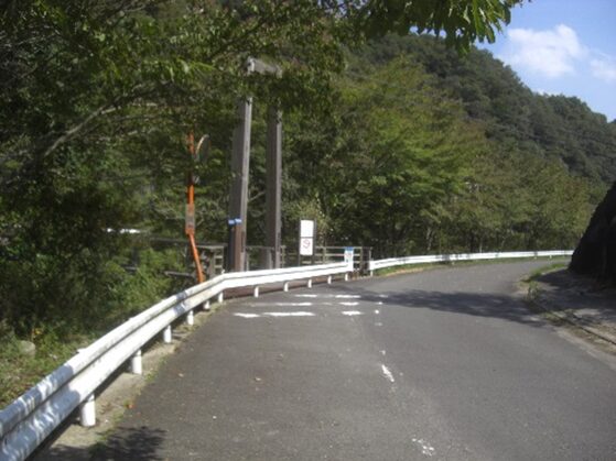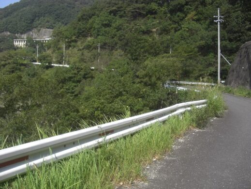 橋から見ると、西側も道が残っていそうでガードレールが見える。どちらにしても街道は湖底であり、ダムに伴なう道なのでいいか