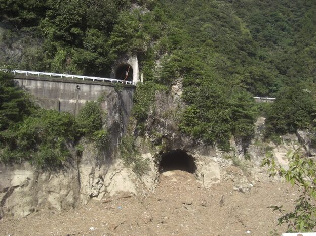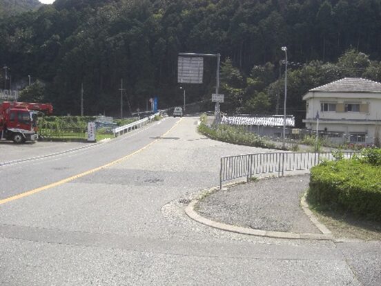 左から604号線がダムの堤を横切る新道が合流してくる(トンネルに向かい振り返る)