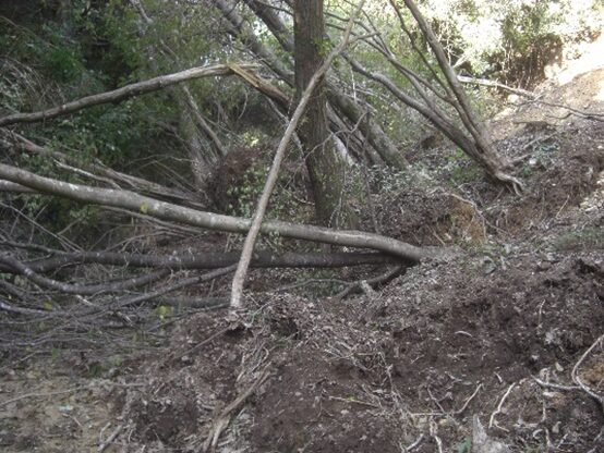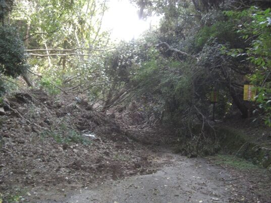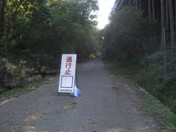 通行止めがよくわかった、完全に土砂や倒木で道をふさいでいる、人が歩くのも難儀と言っても過言でない。元の分岐に戻らなければと一瞬頭をよぎる。なんとか超えられないか少し行ってみる。短い区間で反対側に道が見えているので、左側のかすかな道幅を這いながら進む