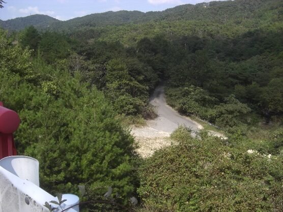 高台の道から一庫集落を望む、新しい住宅に変わっているのは、多分ダムが出来るまで一庫大路次川の氾濫に悩まされたのだろうと想像