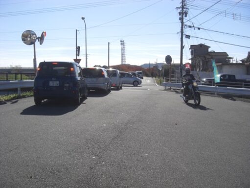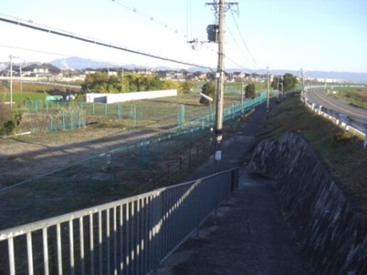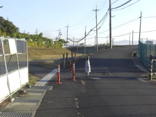 堤防上の道を進むと正面に運転免許試験場があり、道が分岐するので試験場を右に見て左の道を進む