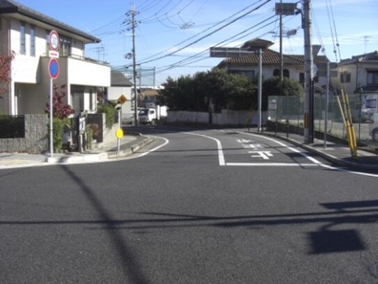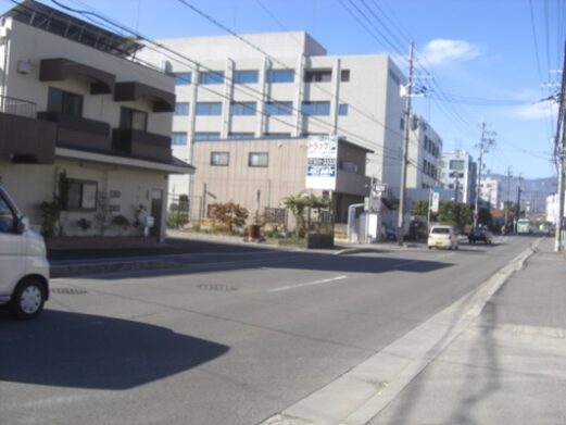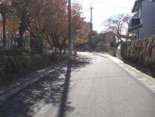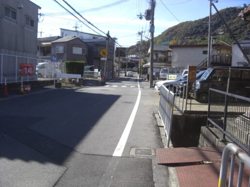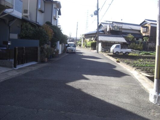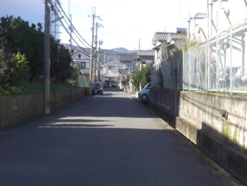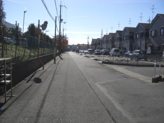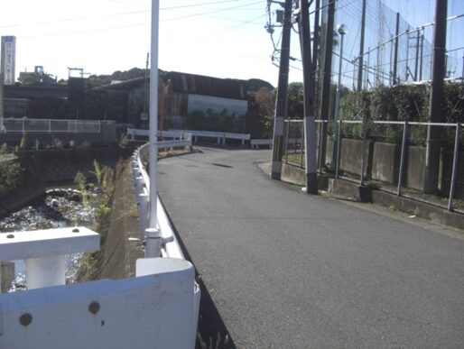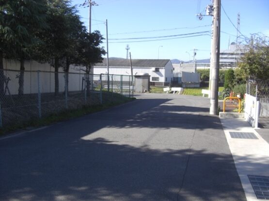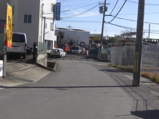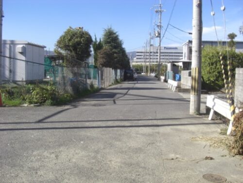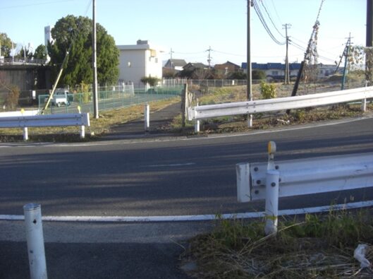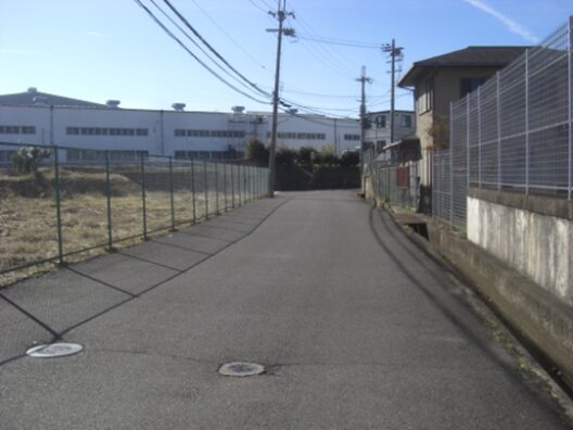 左に折れた道筋、左がサンミック工場で右が新興住宅