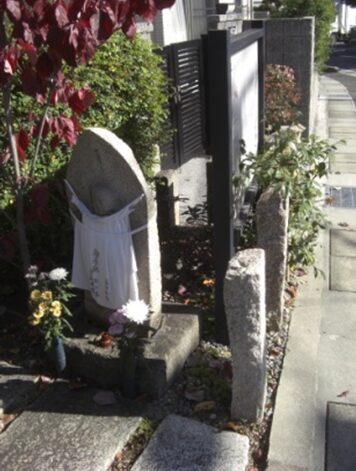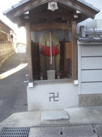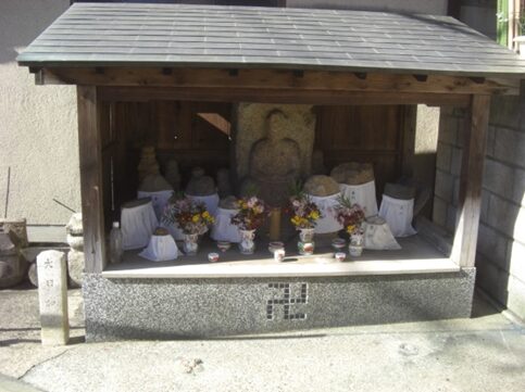 T字路の合流起点の右角に お地蔵さんと道標 よからぬものの侵入を防ぐ守護不入の 黒門 「石敢当」の石柱