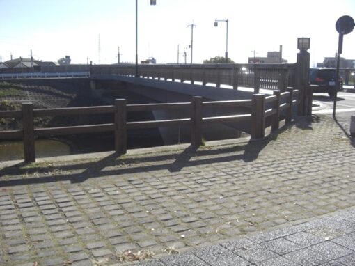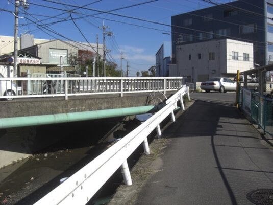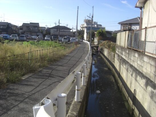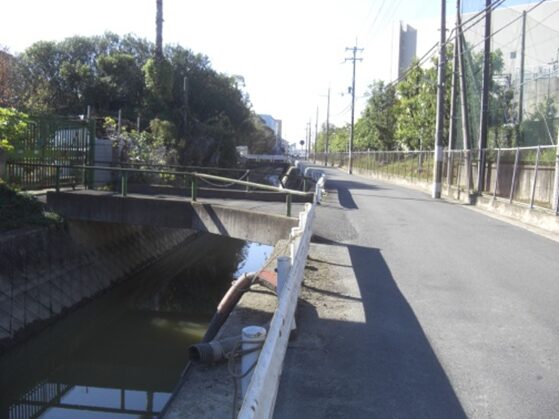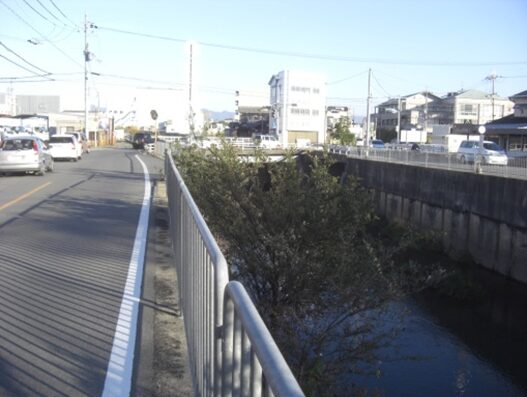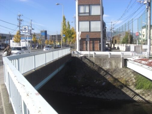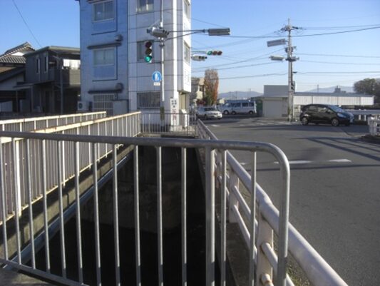 右の小川に沿って東に堤防のバス停から三つ目の橋(四辻)を右に