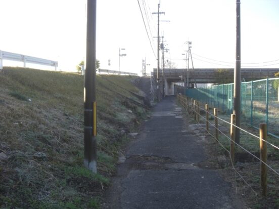 道を振り返ると新幹線の高架を越えたところで、高架下に沿って少し南(左)に折れ、数十mで細い畷道跡を右斜めに進む、そのあたりが七ノ坪で畷跡が続く。