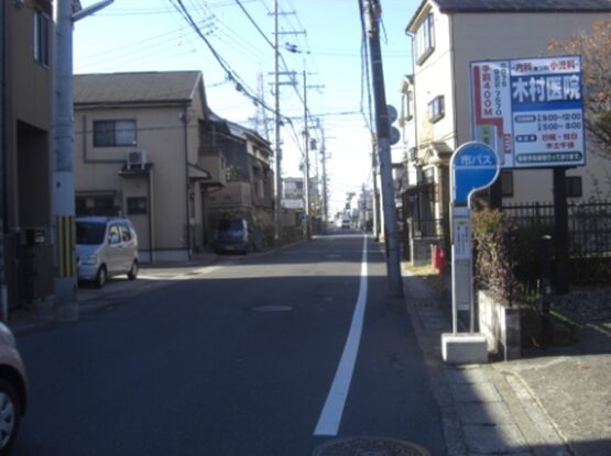 その先のバス停の所で真っ直ぐのバス道と、右の桂川方向へ進む道に分岐する、どちらが旧道かわからないが往路はバス道、復路は右の道を来ることとする