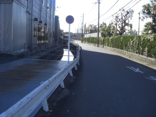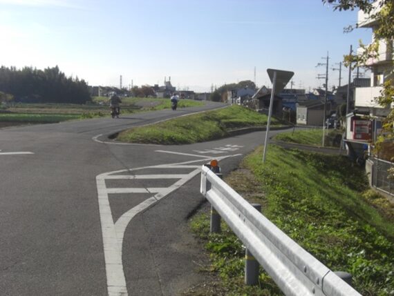右に進めば堤防に上がるが車も多いしガードレールの切れ目から細い道が続くのでそちらを進む