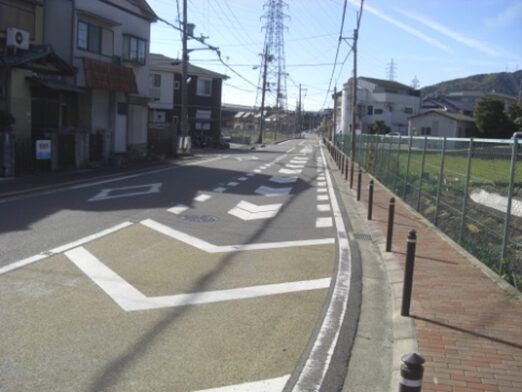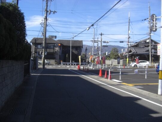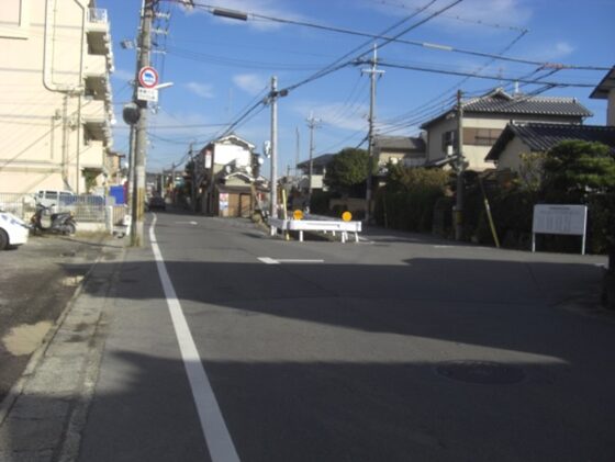 右に神川小学校・JA京都市久我の所で道は3つに分岐しているが一番左のバス道を進む