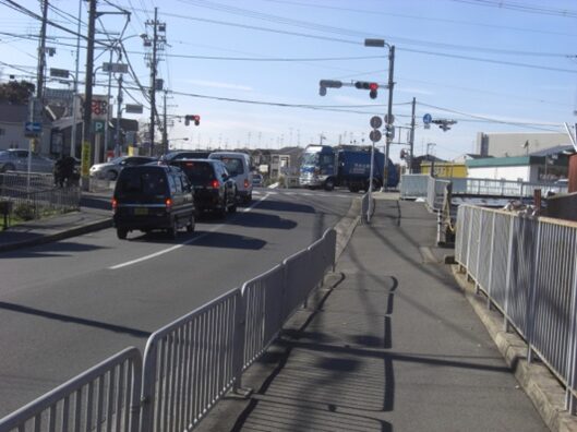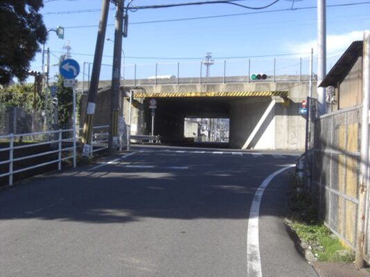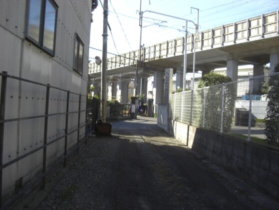 高架下を越えたところで真っ直ぐ進まず、高架に沿って数十m進み斜め右に入る道を進む