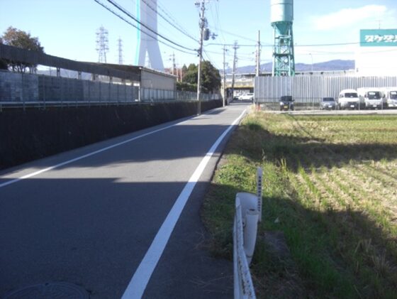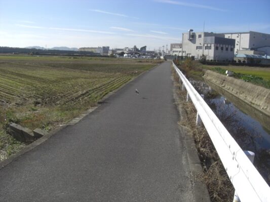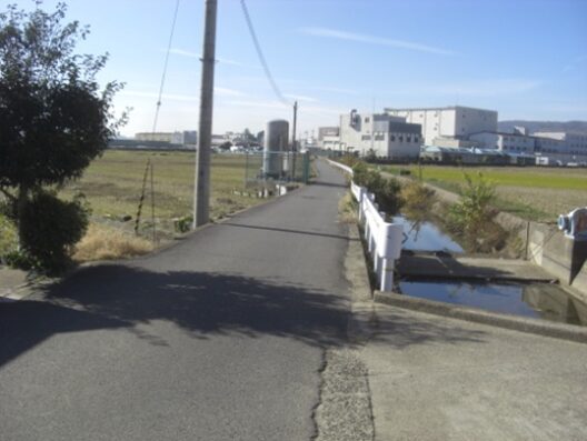 右にJT関西工場の大きな敷地南西に真っ直ぐの水路に沿って道が延びる