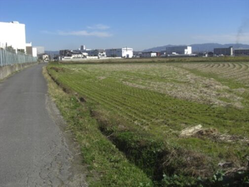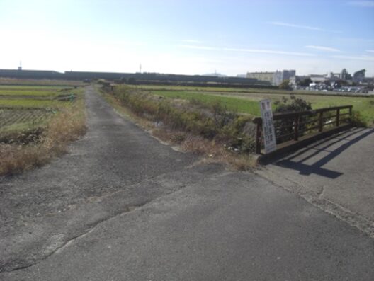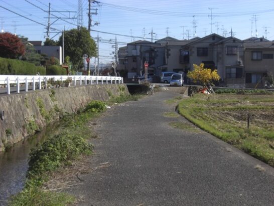 古川町に入り水路沿いの細い道、両側に条里地割だとわかる水田の畦を斜断して道が通る。往時の久我畷の状況を今に残している地点だろう。古川道と呼ばれているらしい