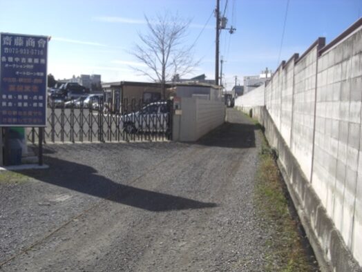 左の塀の中には廃車が並ぶ右は物流センター、その間のブロック塀の中の細い道を進む