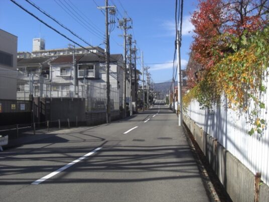 下八ノ坪で長岡京スポーツセンターで畷道が消失しているので右にスポーツセンターに沿って進み、センターが切れる所で左に90度曲がりセンターを左に見る。やがて椿本チエイン京都工場に突き当たるので右に折れて、神足の交差点で名神高速道路の高架下を潜る。