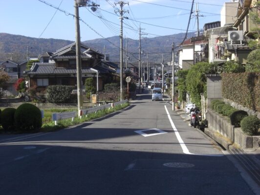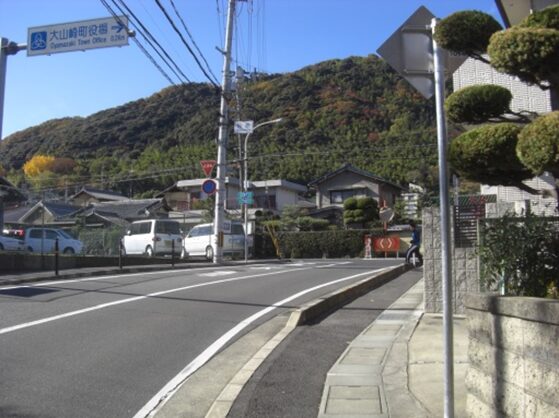 山崎橋を渡り大山崎の集落に入っていく道は一直線に伸びている