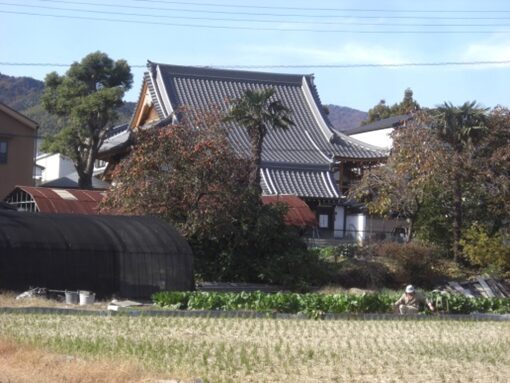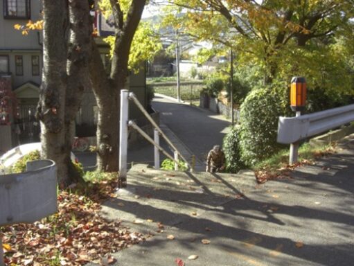 お寺の先左に小さな公園があるので、左にカーブする右の石段を下りて下の道に出て南西の道を進む