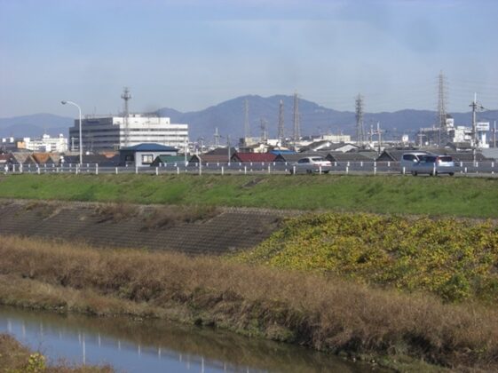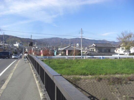 ICをやっと抜けると小泉川の山崎橋を渡る。正面の山は 山崎の古戦場跡の大山崎