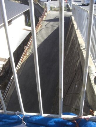 【道順は】堤防を下り真っ直ぐ東へ右の小川に沿って約200m、右の橋にして三つ目の十字路を右に曲がり、約150m南へ突き当たるので道なりに南西に右へ約50m八ノ坪地区を通る、更に西に向きを変えて約100m進む、左はサンミック千代田京都工場で工場が切れたところの角を南に折れる。ここでも約100m余り南に進み二筋目の所から右斜めに旧道があったが一部無くなっているので、そこを右に折れて一筋目のすぐに道を左に曲がると、約20mほどの先で右斜めの細い道が復活するので進む。約60mほどで小さな小川を渡り天王山フラワーハイツを右に見ると、204号線の自動車道に出るので右に折れて約50mほどで落合橋に出る。