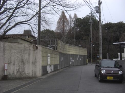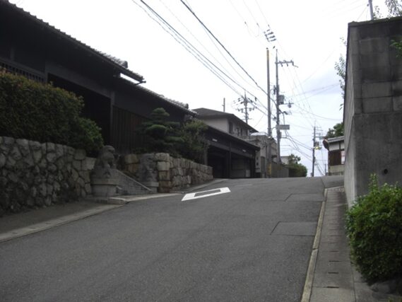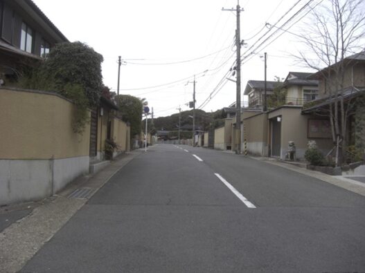 全く新しい住宅の中を南に適当に進む500mほど進むと左に、京都市藤城児童館、清涼院があり、その西側に出てT字路の道路に出る。正面が藤城小学校