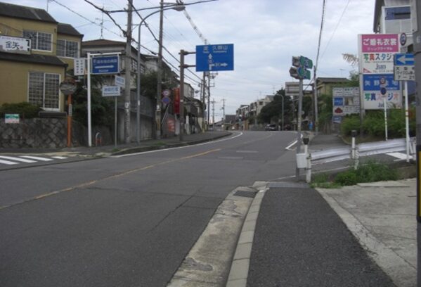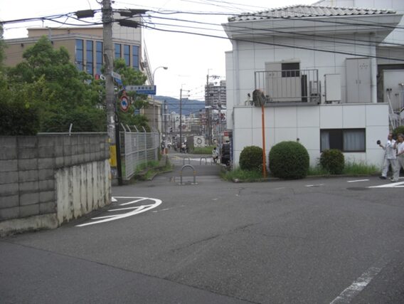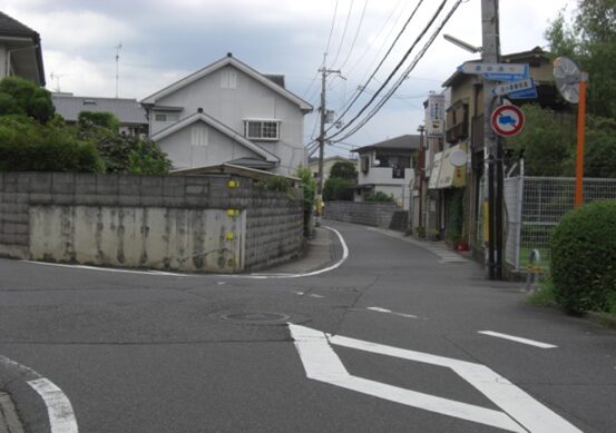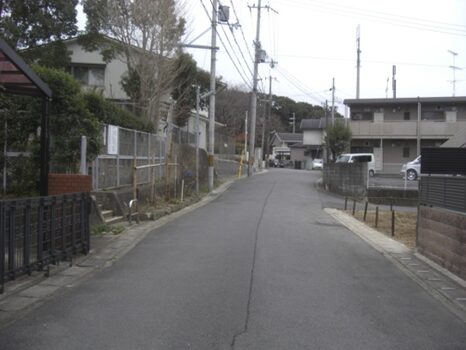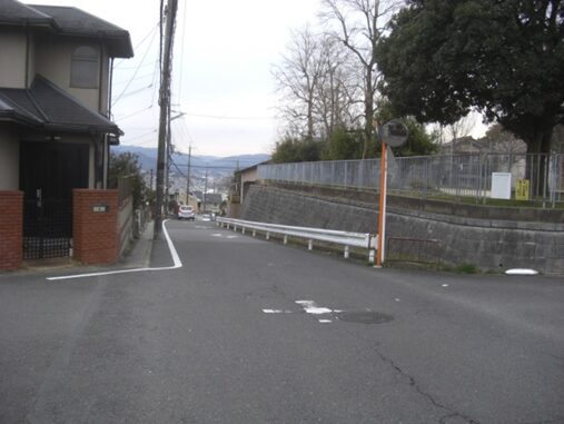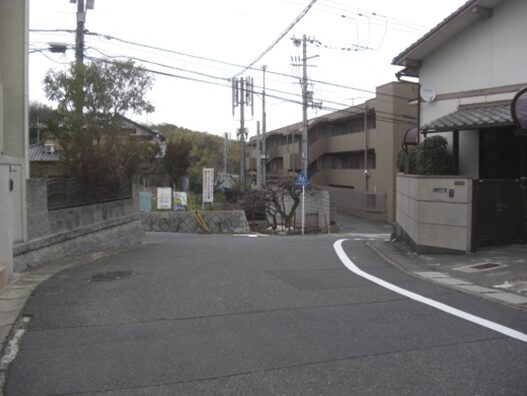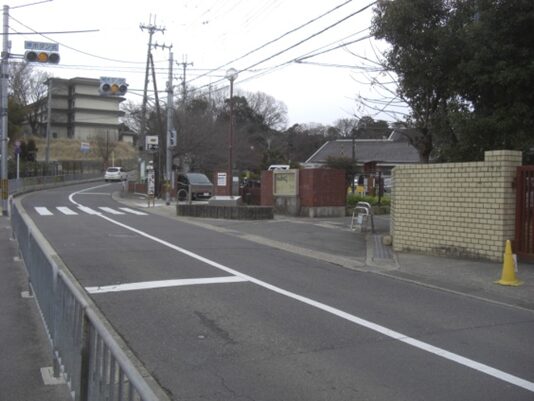 信号から西への道。左の藤白小学校、その前の歩道橋を抜けたところ、北坂が右の角に出てきた辻