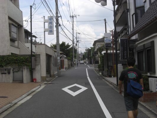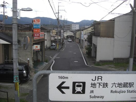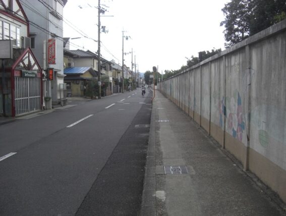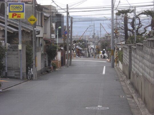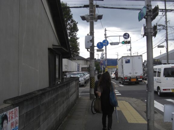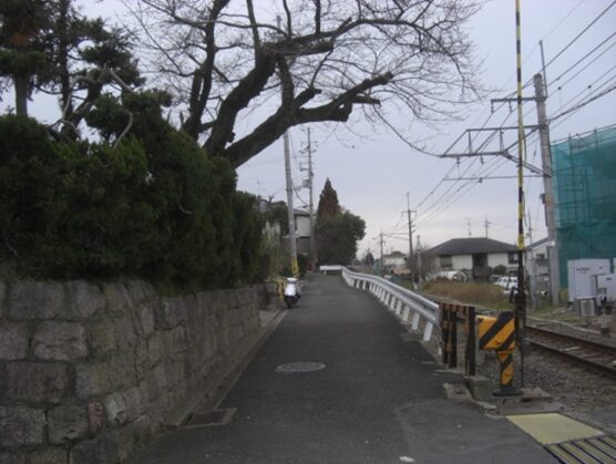 京阪墨染駅の南の踏切から、東へ真っ直ぐ進む、JRの踏切に出て線路に沿って北へ進み、JR藤森駅へ移動。駅の西側の交差点で西から来て駅前を北に通る京街道との分岐点を起点にして、JR線路の西側に沿って緩やかな坂を下り、一つ目の左への踏切を渡る。