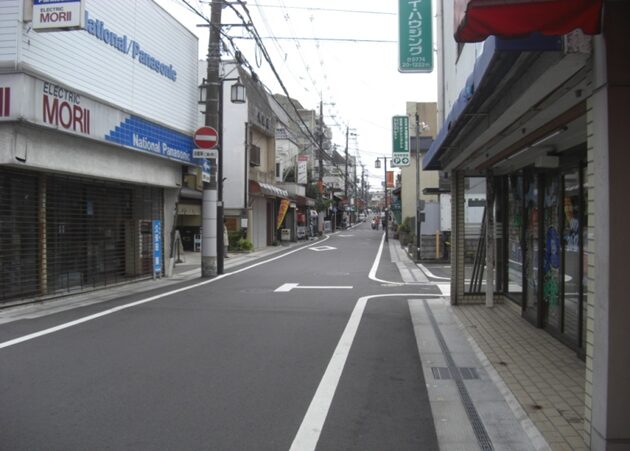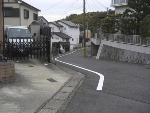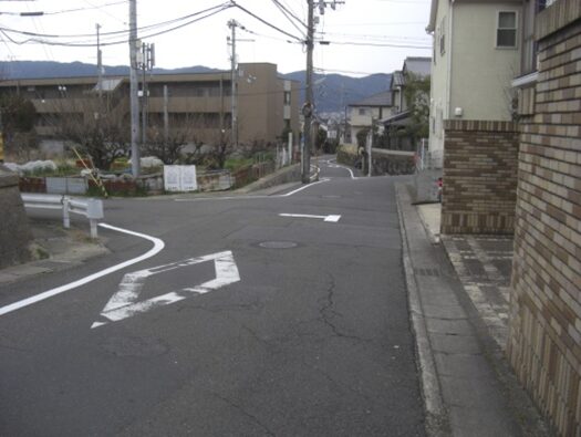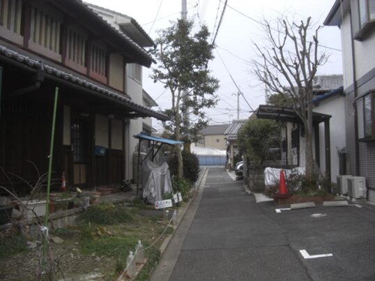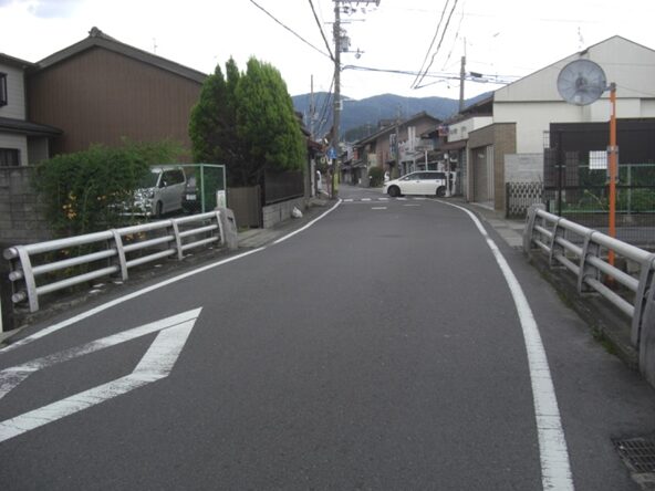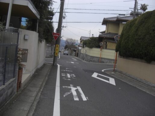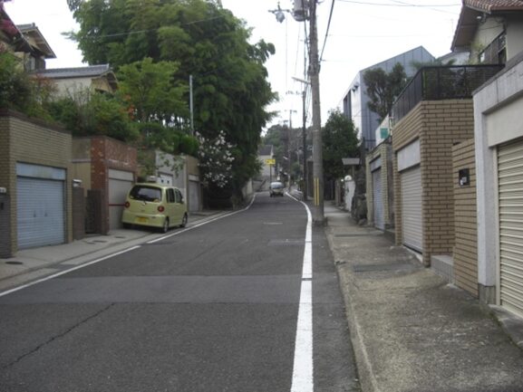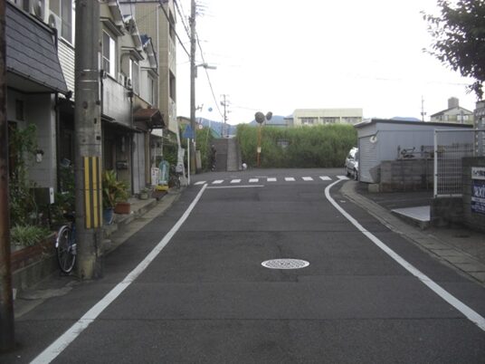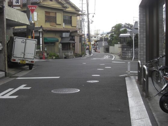 右に折れて下る安信町の道筋