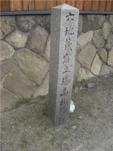 右に折れる左手には 六地蔵の高札場跡碑と道標 が建つ
