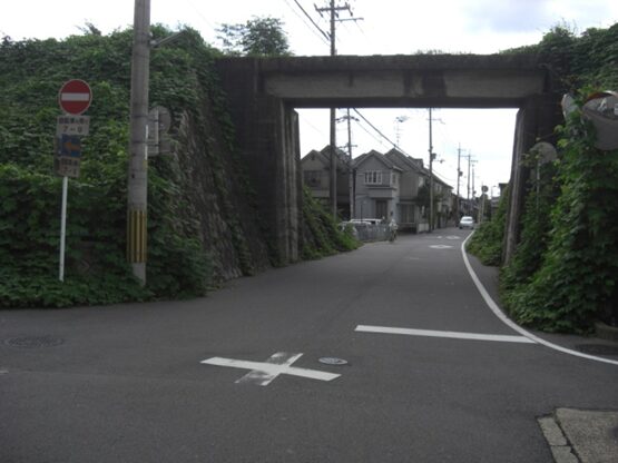 右に折れて辻から100m程進むとJR奈良線の高架を潜る
