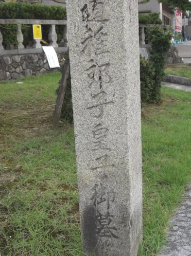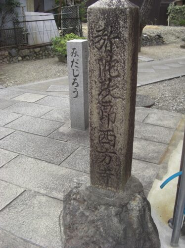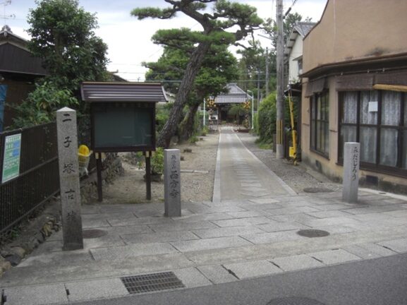 その道の入口のところにある 二子塚古墳の標柱と享保時代の 弥陀次郎西方寺の標柱
