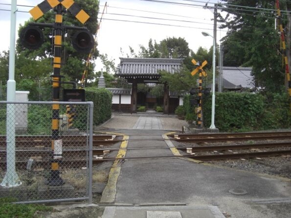 線路の向こう側に西方寺と古墳がある。古墳は西方寺の裏手