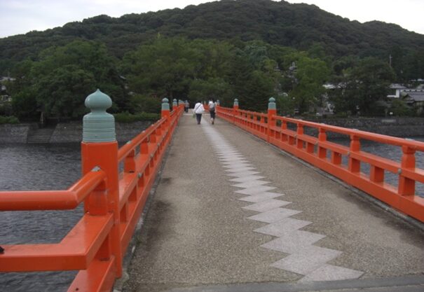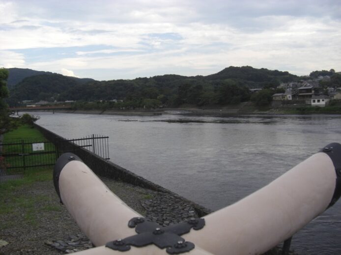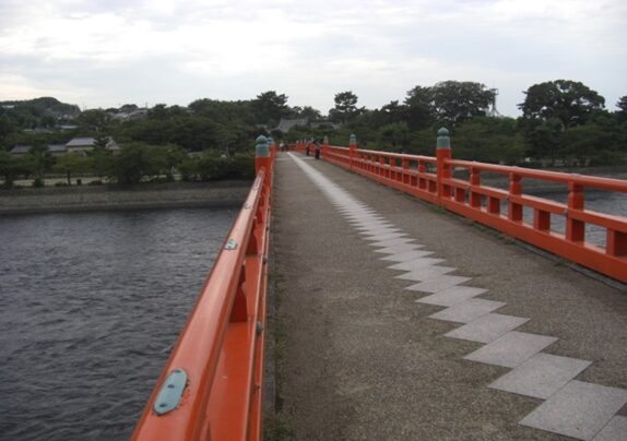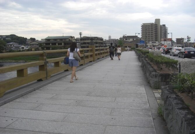 右に折れるところから宇治橋を見る