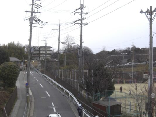 歩道橋より先の道を見る。右のグランドが藤城小学校