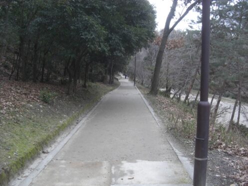 公園の中を歩いて、公園が切れたところで、右への道を下る。右に曲がらず真っ直ぐ少し進むと八科峠にでて近世の宇治街道が左右に通る