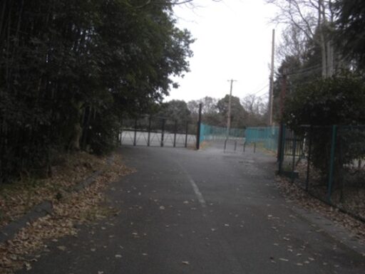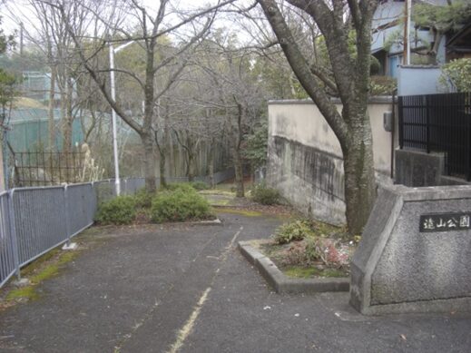 紅雲町関山のT字路を南へいくと写真左の桃山東小学校と右の桃山養護学校の間の狭い道の傍に児童公園があり、その先は金網で行き止まりになっている当たりが切通しとなり関跡