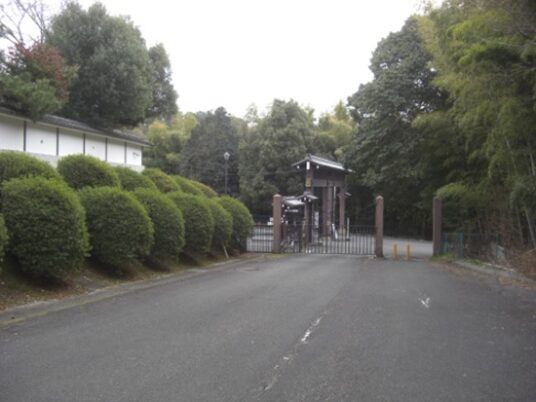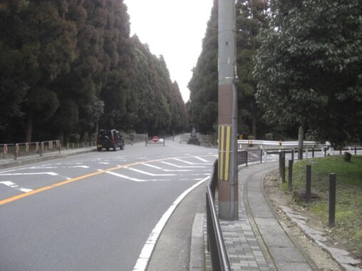 突当り右の道は、御陵への表参道 写真は右から進んできたところ、正面への道は御陵参道で車通行止めになっています明治天皇御陵には参拝しているので寄りません