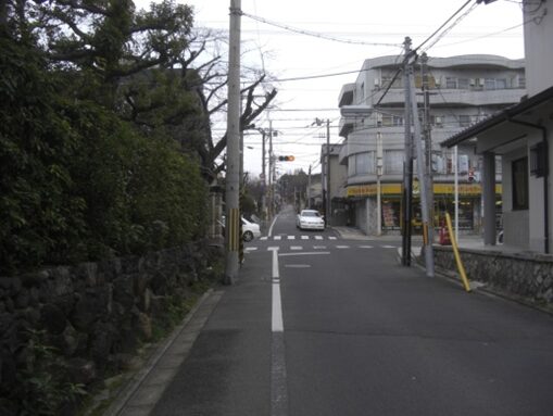 公園の先、ここ紅雪町で右に折れる。真っ直ぐ下っていくと、八科峠を下って来た宇治街道と合流する。そして六地蔵へ進むことになる。