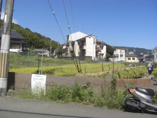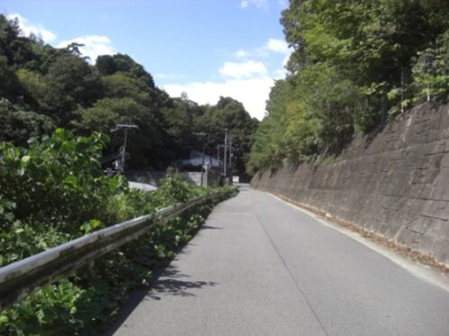 この辺りから左遠望の山が目的地の今熊野観音寺があり、ここでもかつてはこの辺りから真っ直ぐ左に旧道があったが、今は全く痕跡がないので大きく迂回する。