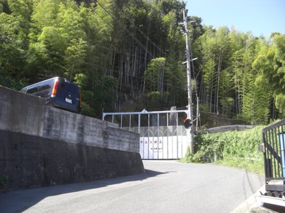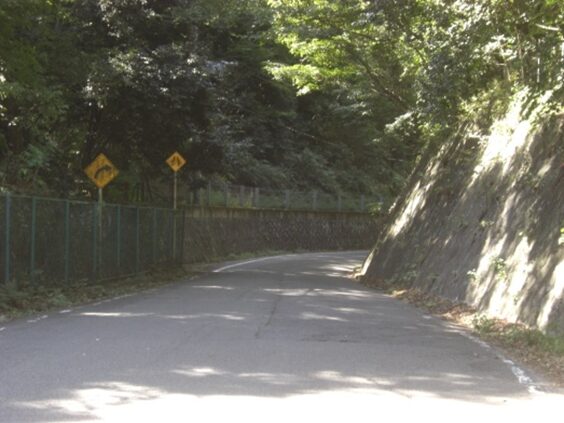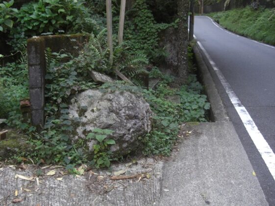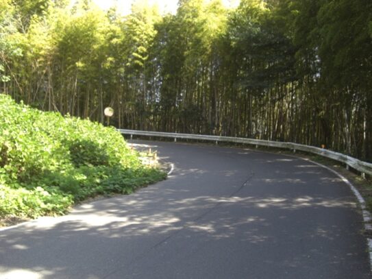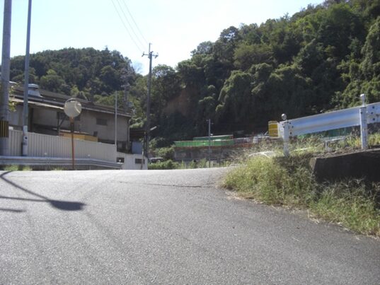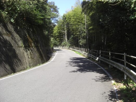 左に折れた先、右一帯は竹や木が茂っている、この辺りからかつての旧道があったが、今は完全に消失している