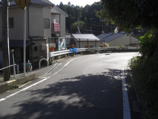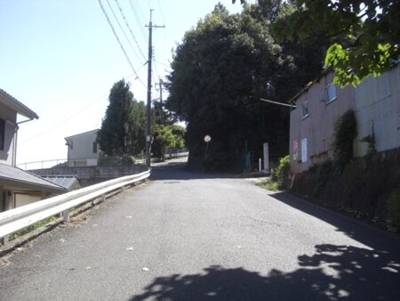 坂の途中、曲がり角で、右の前方かつて旧道があったであろう方向を見る