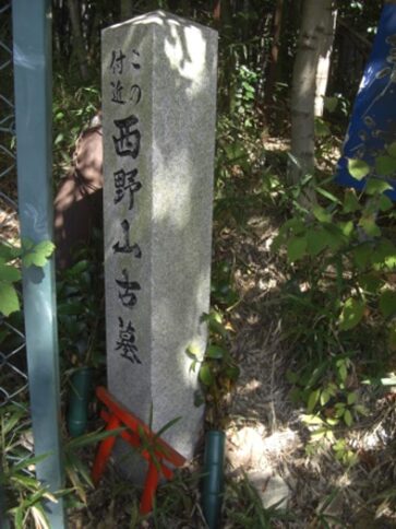 暫く歩いた先で、左に急カーブする。その右角に 西野山古墓の碑 が立つ