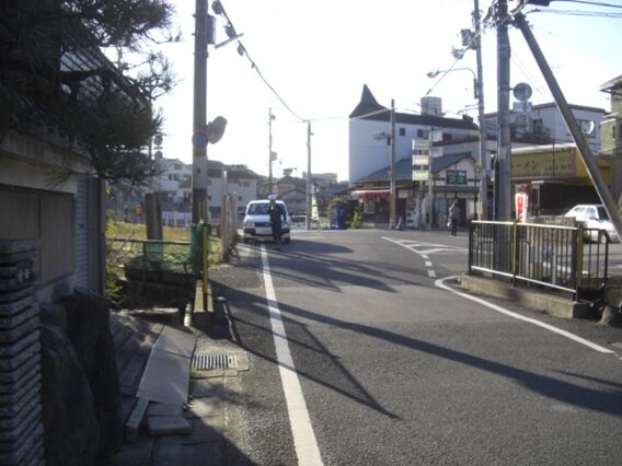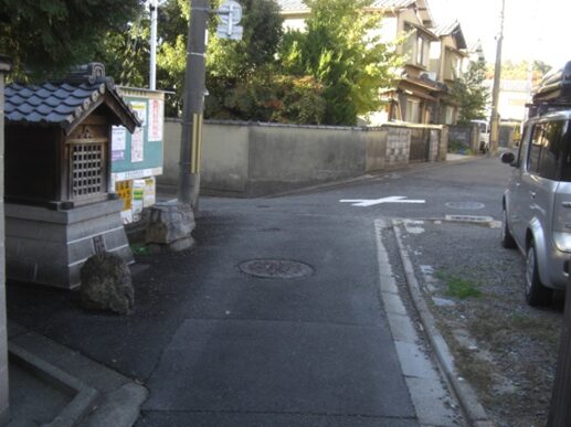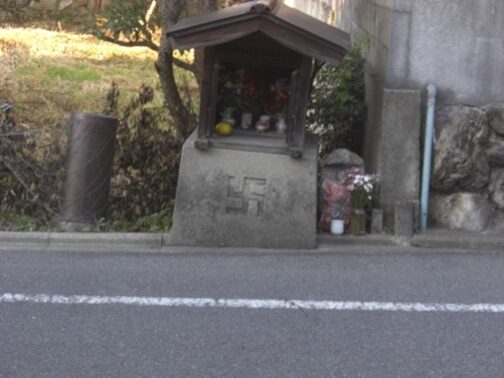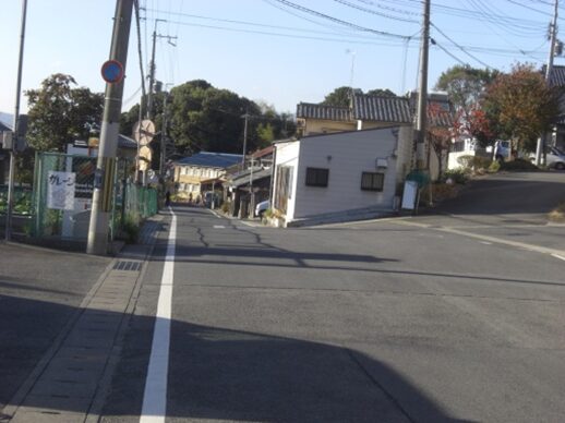 石峰寺から街道に戻り左に折れた道筋 祠の所で緩やかに右にカーブする