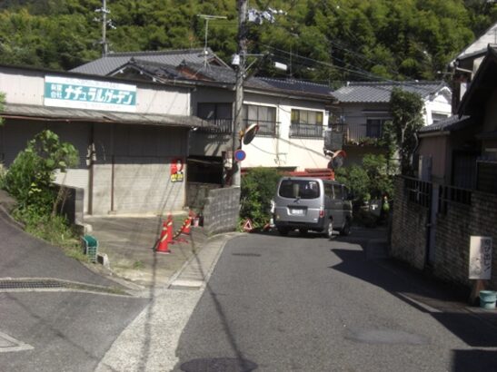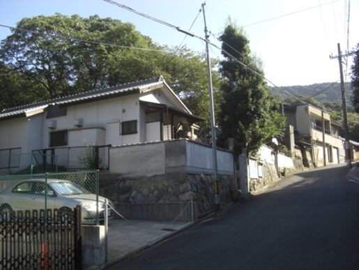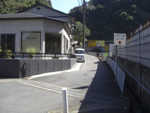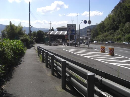 清閑寺の南に出て、右に三木公房がありその前を左にカーブして下ると、国道1号線に突き当たるので、その手前の側道を左に進むと、花山隧道がある。