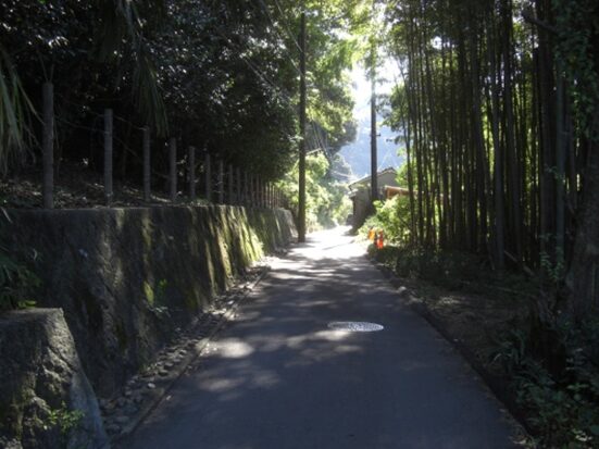 合流点から振り返り、竹林の峠を振り返る。竹林の向こうは国道1号線