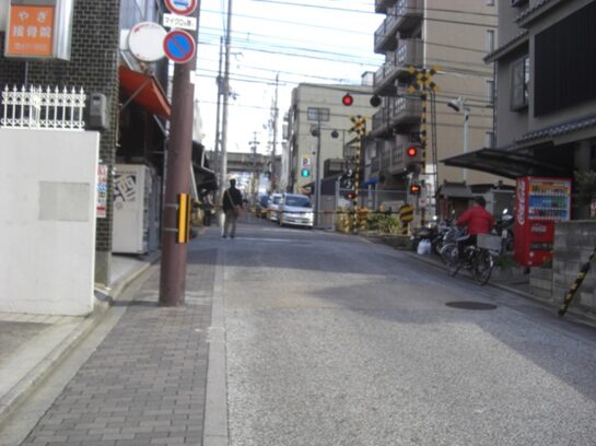 京阪本線の踏切に出る右に  踏切を渡ると左に伏見桃山駅